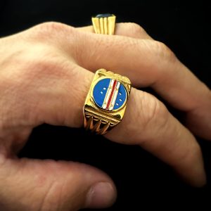 O topo apresenta o símbolo nacional de Cabo Verde em esmalte azul, branco e vermelho, representando orgulho, força e identidade.